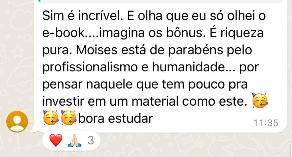 O material será disponibilizado NA PLATAFORMA DE ALUNOS, assim que você efetuar o pagamento, vamos liberar no SEU EMAIL o link para nossa plataforma, ai você faz o login lá e baixa seu material. NÃO VAMOS ENVIAR NENHUM MATERIAL NO SEU EMAIL E WHATSAPP. É tudo via plataforma de alunos.